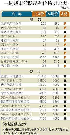 春节前的藏市表现平淡,随着坐商和投资者相继离市回家,成交一落千丈,即使壬辰龙版张的热点也捉襟见肘,许多人对价格涨跌充耳不闻。邮市:壬辰龙版张的炒作明显降温,主要是大量短线客不敢抱筹过年,落袋为安情绪占据主流。因此,壬辰龙全张票和小版张分别下滑到250元和52.5元就不会让人感到奇怪。但因整体价格仍高高在上,不排除春季后继续炒作。此外,2011年度会员票确定,为无锡亚展双连小型张,由此双连张板块在春节前出现上扬。币市:成交极度萎缩,尤其是随着近期国际金价下滑,令金银币交易雪上添霜,偶有购买壬辰龙金银币者,但因买卖双方难以谈拢,夭折的生意不少。