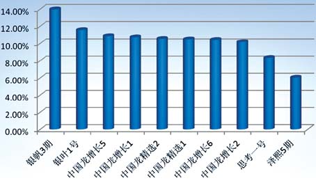 混合型产品平均亏损4.76%,高于股票型产品3.10个百分点。在满3个月正在运行的131只混合型产品中,共有31只产品实现正收益,收益情况较三季度有较大改善。其中,收益最高的产品为国联金如意2号,实现收益为2.73%;收益最差的为东北证券融通一期和中信股债双赢,分别亏损20.01%18.11%,而遭遇黑天鹅事件是这两只产品严重亏损的原因。重庆啤酒为2011年最大的黑天鹅事件。中信股债双赢投资风格极为激进,并热衷于重组概念的股票,而其重仓的神马股份严重拖累了整只产品的表现。