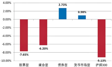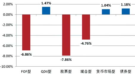 同样受A股市场的拖累,股票型基金和混合型基金大面积亏损。其中,纳入统计的283只股票型基金下跌7.65%,其中表现最好的诺安油气能源股票也仅获得0.40%的正收益;混合型基金下跌6.20%,表现最好的为建信保本混合也仅收益2.28%