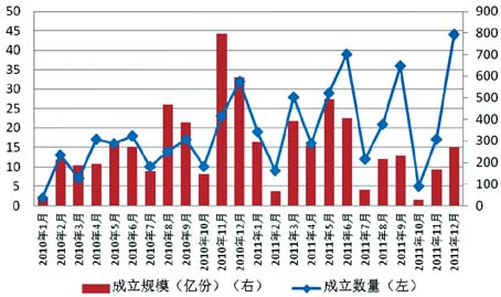 本季度基金成立数量继续回落,共有66只产品成立,较上三季度减少3只,减幅为4.35%。截至2011年年底共有275只基金成立,创下基金发行历史的高峰,较2010年增加98只,增幅达到55.36%2011年是基金发行市场最为疯狂的一年,但进入201110月后,基金公司发行基金的热情开始减退,截至2011年年底,依旧有超过50款产品批而不发。(图5