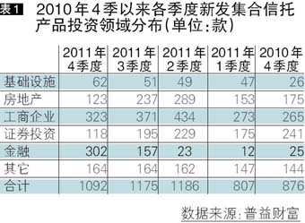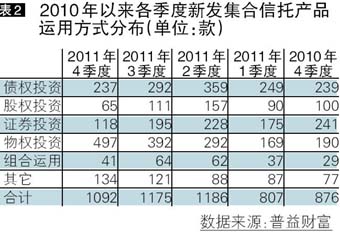 与房地产类信托命运截然相反的是金融类信托产品。今年以来,金融类信托产品的发行量逐季增长,从第一季的12款增至第二季的23款,再增至第三季的157款,而本季度更是增长至302款,是本季度唯一增长的产品类别。(表1