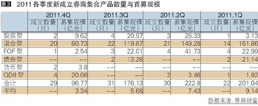本季度券商集合理财产品发行速度有所放缓,由于募集不畅,部分券商推迟发行已经通过审批的产品:本季度共有29只券商集合理财产品陆续募集完成。截至2011年年底共有112只产品成立,较2010年增加13只。