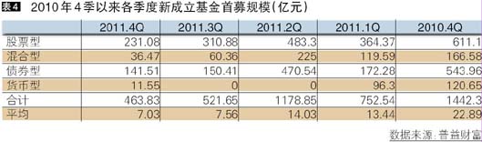 从成立类型看,分别有30只股票型(包括指数基金、QDII基金;分级基金分开计算)、7只混合型(包含保本型基金)、26只债券型(分级基金分开计算)和4只货币市场型基金成立。自2010年四季度以来,债券型基金开始抢滩发行,这种状态一直延续到2011年年底。