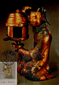长信宫灯出土于1968年出土于河北省满城陵山西汉中山靖王刘胜和夫人之陵墓。1973年发行的《文化大革命期间出土文物》邮票中就有这一枚,2000年中国邮票公司发行《中山靖王墓文物》邮票一套,又有这一枚。此枚极限明信片加盖文物出土地“河北满城”邮戳,符合国际邮联规则。