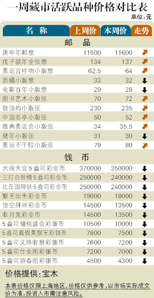 “中行百年港钞随着2月下旬货源逐渐增多,加之价格仍在千元上方,令投机客退避三舍,市场热点明显降温。如此,短线资金回流邮票和金银币板块,则使2月末藏市隐现峰回路转之兆。邮市:壬辰龙全张票和小版张继续在350元和90元附近盘旋,热点消退。不过上周古典名画系列版票却异军突起,富春山居图小版票创出200元新高,清明上河图神骏图小版票也分别攀升到56元和65元,市场热点转换迹象隐现。币市:壬辰龙金银币买气逐步上升, 5盎司壬辰龙彩银币攀升到7200元附近,1盎司壬辰龙彩银币和本色银币分别维持在1350元和1200元附近。