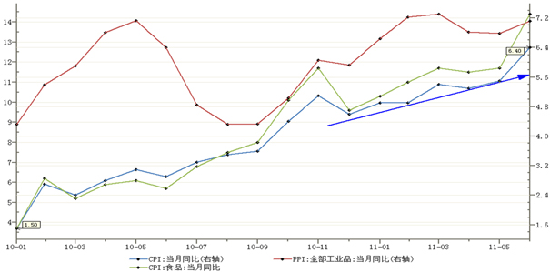 此外,市场普遍预测春节消费旺季将带动物价上行的压力,国内以蔬菜为代表的食品价格面临着全面上涨压力。国际市场上,美元指数在2011年年初开始从80的高位回落,美元贬值带动能源、大宗商品、农产品等以美元标价的商品价格大涨,衡量国际大宗商品价格走势的CRB指数在2011年继续上涨,全球商品的价格上升给国内带来极大的输入型通胀压力。
