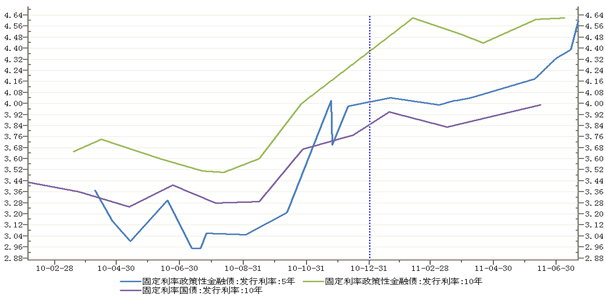 11 月份债券收益率大幅回落,已低于年初水平,曲线呈现陡峭化下行的特征,政策性银行债收益率降幅高于国债。11月份前两周,收益率持续快速下降,并且已低于年初的水平,10年期国债收益率一度逼近3.5%关口,而3年期央票收益率更是在停发之后从3.9%一路下行至3.5%的水平。出现如此大幅的回落是因为得到了宏观基本面、政策面、资金面的全面支持。进入后半月,随着二级市场收益率已经降至今年以来的最低点,在年终考核时点临近的情况下,交易型机构的纷纷选择获利回吐,使得收益率的下降受到抑制,并有所回升。10年期国债收益率一度回升至接近3.7%的水平,10年期国开债也从前期的4.2%以下回升至4.3%附近,其它期限收益率有不同程度回升。