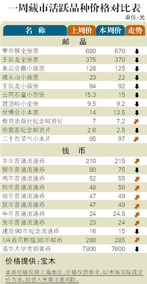 藏市步入5月中旬以来,热点品种的表现不尽人意,不少品种因交易不畅而陷入阴跌状态,歇夏期的征兆已若隐若现,如此现象可以会延续2个月时间。邮市:市场人气萎靡不振,大多数邮票价格缓慢回调,其中“神骏图”小版票跌至77元,“唐诗三百首”套票小版张回调至25元,去年发行的“无锡亚展”小版张跌到9.4元,已跌破面值。币市:整体低迷的走势属于意料之中,惟“熊猫金币发行30周年”1/4盎司银币买气活跃,而供应短期跟不上,导致价格上扬至300元附近,但2012版“熊猫”1盎司银币却下滑到275元。