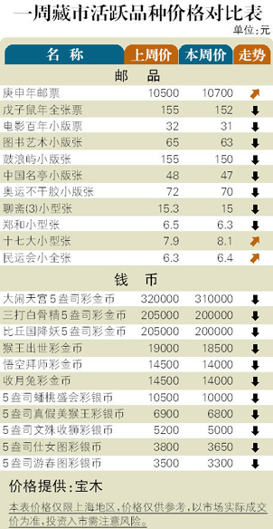 藏市经过10天回升后,再度出现回调表现,部分品种振荡加剧,尤近期热点邮品最为突出,显示出市场短线将步入振荡状态。邮市:新发行的明清承具小本票跌至9元左右,仅为邮局售价的75%。壬辰龙赠送小版张下挫到49元,桂花无锡亚展无齿小型张分别为330元和58元。老邮中的纪71“开国大典邮票价格攀升到2300元,中美邮展小版张盘旋在8200元附近, J22“毛主席纪念堂套票坚挺在85元。币市:壬辰龙彩金银币微挫到3450元,壬辰龙”5盎司彩银币跌至6200元,五台山”1公斤银币下滑到14800元。2012熊猫”1盎司金币和银币分别回调至10300元和255元。
