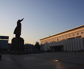 列车内部的设计有点欧洲风格,八人一个包间,午餐是炸鱼、鸭肉、卤蛋、泡菜和米饭,味道很不错,尤其是那米饭看似很糙口感却很好,至少纯天然吃着放心。但是朝鲜的不发达在铁路建设和管理上也相当明显,从新义州到平壤基本上是单轨,而且机车的电力也不能得到完全保障,走走停停,200多公里竟然用去了6个多小时。到达平壤时天色已经完全暗下来,夜晚的平壤隐在电力缺乏的昏暗里,大巴车把我们带到了更偏僻的西郊西山宾馆。这里属于一级宾馆,30层高,这里的设施和国内的二星级宾馆差不多,晚间限时供应热水,房间甚至还有冰箱,电视能收到中央一、四套和香港凤凰卫视以及两个朝鲜节目。