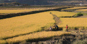 由于没有过度的工业污染,朝鲜的天空显得异常蔚蓝,所有的河水也显得那么清澈。正是收获的季节,金黄的庄稼有的已经被收割,有的正在等待,远处的村庄宁静而整洁。生活的美好并没有因意识形态的不同而改变。