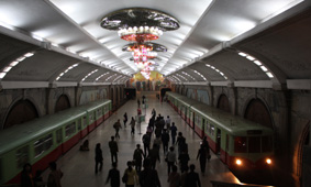 平壤的地铁号称是世界上最深的地铁。为了战备需要,地铁修建在地下100多米的深处,据说一旦发生核战争,大批军队和市民就可以转移到地铁里抵御袭击。地铁的站台修得富丽堂皇,壁画、雕塑、巨大的吊灯,很有俄罗斯地铁的风格。
