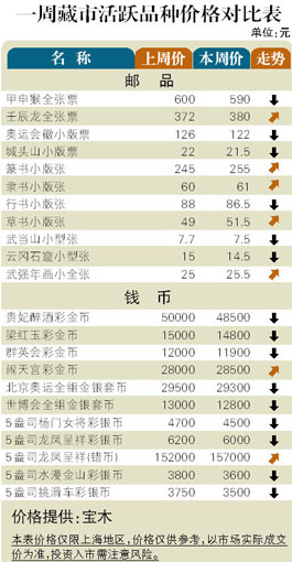 走进7月初的藏市略显活跃,虽然成交并没有明显放大迹象,但热点品种止跌反弹征兆则若隐若现,歇夏到了中期的市场变化值得投资者留意。邮市:壬辰龙生肖版张炒风重起。其中壬辰龙小版张本周初已创出115元新高,而壬辰龙全张票、赠送小版张和小本票也分别扬升至380元、50元和65元。币市:五台山金银套币继续阴跌,7月初价格回调至4700元,熊猫金币发行30周年”1/4盎司银币则在买盘推动下收复300元整数关,本周初扬升到320元附近,受此影响2012熊猫”1盎司银币微涨至240元。此外中国银行百年加字金银套币价格盘桓于4800元左右。