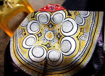 传统盛装的图案是不能变的,多少辈子没变过,这个螺旋纹就是蓝竹草的图案,12个圈圈(大的8个,小的4个)代表12个月不能生病,意味着一年平安吉祥。