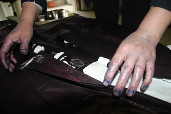 在苗寨,锡绣都是一代代手把手教出来的,当女儿出嫁时,母亲要将一套绣好的图案交给女儿,让其继承锡绣传统(图2)。锡绣完全依靠手工来完成,用剪刀将锡片剪下长约18厘米,宽约1毫米的细锡丝条,丝条拉直,一头打一小勾,另一头剪成针头状。把准备好的布垫铺在已绣有图案的棉布上,用针将图案的一根棉线挑出后,再用针头状的细锡丝条穿过已挑出的棉线,把打一小勾细锡丝条紧扣棉线,用剪刀把细丝条剪下,并将余下的细锡丝条反扣在棉线上,这样就完成一个扣锡过程。按棉布上的图案周而复始进行,也就形成了锡锈制品(图3)。