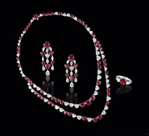 2012年北京保利秋拍,心动 49.3拉心形天然缅甸鸽血红红宝石项链、耳环、戒指套装,最终以649.75万元成交(含佣金)。