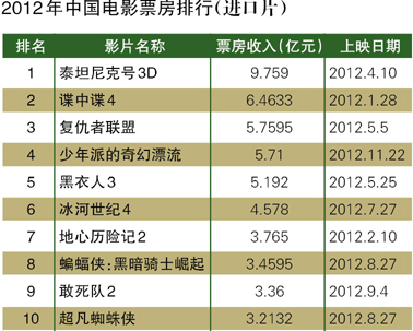 ■ 砂时计 从来没有一个年份像2012年这样,和电影如此紧密的相关着。2009年美国灾难题材影片《2012》一经上映,风靡全球。其引用玛雅历声称的“2012年12月21日地球将发生毁灭性灾害,人类社会将随之灭亡”的情节,在电影上映后一直弥漫全球。加之近年来金融危机蔓延,各国经济疲软,政治局势亦动荡不安,这一浓重的末世情绪因此广泛而深刻地影响了整个国际社会。在中国,无论真信也好,附会也罢,终归,这样真真假假或多或少的末日心理极大刺激了整个消费市场,电影消费更首当其冲。根据国家广电总局12月19日发布的数据显示,2012年前11个月中国电影总票房达141.5亿元,相较2011年全年的131亿元,有了大幅提升。截止2012年12月31日,中国电影票房进口片和国产片排名前十的影片基本确定。(表一、表二) 国产影片与3D 据报道,随着2012年进口分账片配额增加至34部,国内电影市场格局正在面临调整,今年前三季度国产影片市场份额仅占40%左右,跌至近年来同期最低,而今年全年国产片市场份额能否继续多年来保持的50%以上则还需要靠12月贺岁档的国产影片发力拉动。可以看出,2012年中国的电影市场依然是引进片优势明显,但在最强音里已经出现了国产片了。这其中《画皮2》堪称翘楚。《画皮2》的成功是多方因素共同成就的,而这其间尤以其在国内只以3D方式上映最为显眼。无论你愿意从哪个层面去评价这件事,但其背后代表了中国电影人已经完全把握并能很好地运用电影工业发展趋势带来的成效这一实质。3D电影自《阿凡达》起,便真正从电影表现形式的配角,化身和2D联袂主演之势出现在观众眼前。今年以来几乎所有进口大片都配有3D排片,动画电影更是几乎只以3D形式放映。而国产片也不乏前期就以3D形式拍摄的。去年《龙门飞甲》以国产3D电影先锋之姿狂揽5.5亿票房。《画皮2》更完全抛弃2D屏幕,借此一举登上全年电影票房宝座。可以预见,在此后,电影,特别是商业大片将更多以3D形式呈现观众眼前。而这一发展趋势对中国电影的观影设备提出了更高的要求,其实也为中国院线建设的更新换代以及电影相关产业的发展提供了契机。 超能英雄及中国元素 如前所述,末世情节两三年来一直在全世界范围内蔓延。这对电影行业的影响还表现在灾难题材和超能题材的持续升温。而这一效应在国内体现的更为明显。今年有两部之前上映过的灾难题材影片泰坦尼克以及2012经过3D重制后全球上映,而其中在中国的票房最为亮眼,泰坦尼克3D版更是拿下今年中国电影票房的头把交椅。在人类面对力所不及的灾难时需要被拯救的。所有理性外的超能英雄就这样应运而生了。西方人的思维一直是强调个人英雄主义,这与其社会扁平化民主化分工化,强调协作有着分不开的关系。与此同时,国人自古以来不讲求个人在集体中的出挑。但随着社会结构的不断稳定,个人性格教育亦趋向于体现个性、追求异化,加之今年甚嚣尘上的末世理念,国人对于外来的超能英雄们也体现出了几乎顶点的热情。今年好莱坞出品的超能类型的进口片在中国的表现也可圈可点,前十中与超能英雄或英雄类相关的占了七席,且票房表现力远超国产大片。正是鉴于此,很多这一类型的影片都在拍摄期间将吸引中国投资和增加中国元素考虑其中。已经上映的《变形金刚3》,《黑衣人3》,《环形使者》,以及正在拍摄的《钢铁侠3》等等都是如此。但就观众的观影体验来说,除去中国的投资,影片中的中国因素多少都有些牵强赴会,特别是一些植入广告,过于生硬,影响效果。怎样在吸引中国观众眼球又能很好融入影片整体效果中,这是制作者和投资者需要共同探讨的课题。 中国式类型片与其式微 此处所说中国式类型片是一种很难界定之后的模棱说法,主要包括了各种大导演们醉心痴迷的意图表达历史、战争、人性、命运等等复杂课题的各路古装大片。中国式大片是整个当代所有大导演或者说意欲成为大导演的导演们,心口永恒的朱砂痣。从张艺谋到陈凯歌,从冯小刚到陆川,不一而足。究其缘由,一是近年来很多行业外资金的大量涌入,而此类资金的投放,基本以所谓的国产古装大片为方向。许多片方为吸引投资,从立项到剧本、导演、演员等等都匆匆上马,且投资方对制作方的话语权增多,就演员、剧本甚至导演等方面的掣肘加剧。就电影艺术本身,这绝非好事。现实题材在过审时较之古装题材难度增加,因此也从另一方面导致大投资的影片集中在古装片。二是这一类型的片子在海外发行时更加吃香(但自去年以来,华语片海外市场急剧萎缩),特别是,在申报奥斯卡最佳外语片时更有竞争力。这一现象也是自《卧虎藏龙》夺得奥斯卡最佳外语片后,给华语电影添的一块儿心病,直接导致中国的导演们拍片时做的都是美国梦。其本质上,就不接“地气”,不是为中国观众而生的。那么这些说不清道不明的类型片本身在流失大量观众,甚至流失观众对很多导演的信心,也就不足为奇了。其实这一现象早在2011年就已出现,观众审美的疲劳在今年达到顶点,2012年上映的《铜雀台》、《王的盛宴》均前十不入,后者甚至不过亿,与其行销时主打的大投资,大导演、名演员等等比起来,票房表现乏善可陈。电影行业当然需要资金、导演、演员、技术等等大投入的商业大片,但如何将商业大片和民族题材很好结合,如何制作符合