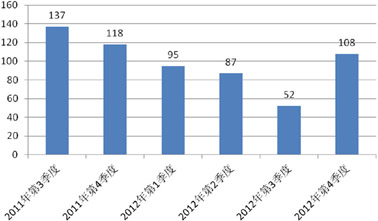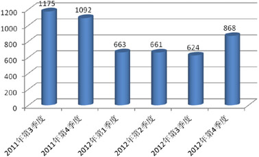 图1 2011年第3季~2012年第4季集合信托新品发行量(单位:款)