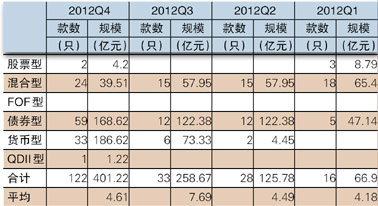 2012年第4季,券商集合理财产品发行量实现强劲增长。本季新成立产品122款,环比增加2.7倍;首次募集规模合计401.22亿元,较上季增加55%;平均募集规模4.61亿元,较上季的7.69亿元有所下滑。其中,募集规模最大的是招商证券旗下的货币型产品——招商智远天添利,募集规模为36.28亿元;募集规模最小的是中信建投证券旗下的债券型产品——中信建投优债1号,仅募集到0.33亿元。