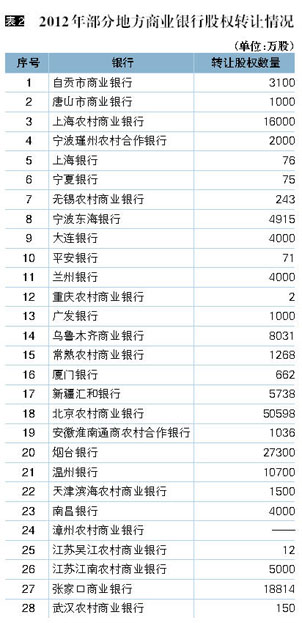 注:表1信息截至2013321日;表2商业银行基本按转让时间由近及远顺序排列,如自贡市商业银行股权转让时间在201212月,而武汉农村商业银行股权转让时间在20123月。