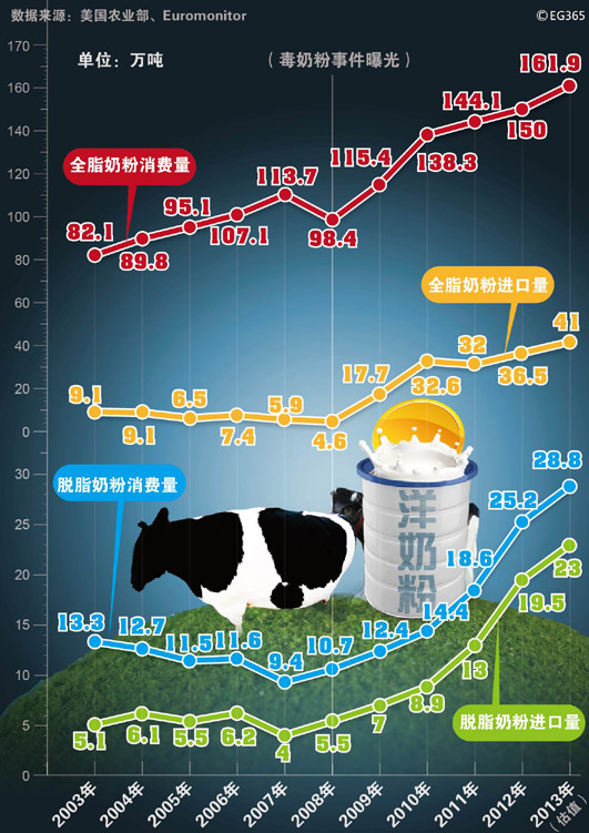 爆发于2008年的三聚氰胺毒奶粉事件造成了6名婴儿死亡,超过3万名婴儿患肾结石的恶果。丑闻随后引起了全国范围的恐慌,并摧毁了中国奶制品的信誉。此后中国奶粉进口量和外国品牌的奶制品在中国的市场份额均迅速上升。图/CFP