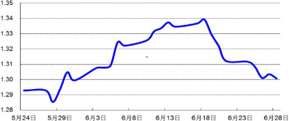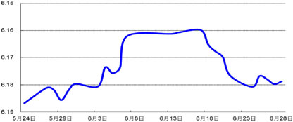 上周,人民币兑美元中间价呈横盘整理走势,当周变化不大,于上周五报6.1787元,较621日微跌0.03%;欧元兑美元下跌0.87%,报1.3008美元。