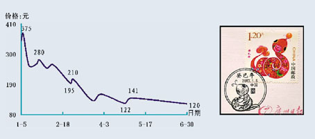 邮市在上半年的唯一兴奋点,就是15发行的癸巳蛇邮票,而这枚生肖邮票的发行并没有给邮市带来希望,相反却成了短线炒家的梦魇,因为介入此票的炒家在半年后已输得一塌糊涂,特别是参与癸巳蛇全张票炒作者更惨。从市场价格看,癸巳蛇全张票面世之初的市价即高达350元,而到了6月底市价已狂泄至120元,半年时间的跌幅就高达65.7%,且迄今尚未回稳的趋势,而与24元的面值相比,即使跌得如此深,却依然有400%纯溢幅,此情对炒家而言绝非好兆头,因为握有货源的一级市场,其利润依然很丰厚。