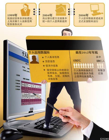 我国征信体系建设始于1999年。当年,上海开展个人消费信用信息服务试点;2004年,商业银行建立全国集中统一的个人信用数据库;2006年该数据库建成并正式全国联网运行。截至2012年年底,个人信用数据库已经收录了近8.2亿自然人的信息并为他们建立了信用档案,其中2.9亿人有信贷记录,全年累计查询分别约2.7亿次。/CFP