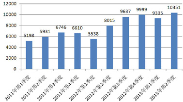 2013年第2季度,受年中因素影响,银行理财产品发行量大幅增长。商业银行理财市场共发行了10351款理财产品,较上年度同期增长幅度为29.15%,较上季度增长幅度为10.88%。(图1)