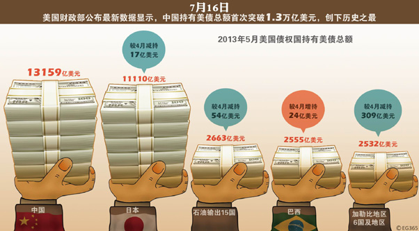 美国财政部公布截至20135月底世界各国及地区持有美国国债状况。5月,中国所持美国债环比增252亿,总计13159亿美元,稳居世界各国/地区之首。图/CFP