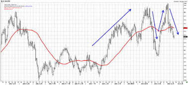 2013年5月份之前,澳元延续去年下半年以来的区间震荡格局,主要震荡区间在【1.0150,1.06】之间。5月份之后,伴随黄金和大宗商品价格下跌,美联储退出宽松预期升温,澳洲央行降息、澳美利差缩窄,以及澳洲、中国经济表现不佳等多重利空因素不断涌现,澳元步入快速下跌通道,跌破此前阶段性支撑位1.0150,跌破平价,最低跌至0.9040的33个月低点。