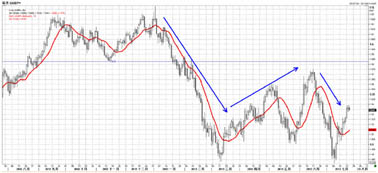 从周线图来看,欧元处于下跌的楔形整理,表明欧元长期处于下跌走势,欧元今年两度试探200周均线均告失败,目前该线在1.34附近。从日线图来看,欧元一旦跌破1.2750的位置,同时也是61.8%回调位,之后很可能会跌向1.20。