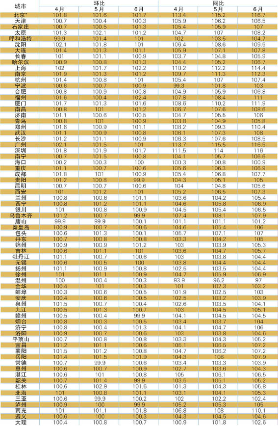 新建商品住宅价格方面,70个大中城市中,6月环比上涨的城市有63个。其中,涨幅最高为2.4%(福州市)。上涨幅度明显的城市还有上海(2.2%),岳阳(1.9%),南充(1.8%),北京(1.7%),深圳(1.7%),桂林(1.6%)和厦门(1.6%)。6月同比上涨涨幅最高的为北京(16.7%),广州(16.5%),深圳(16%),上海(14.4%),南京(12.3%),厦门(11.9%),福州(11%),郑州(10.4%),南充(10.1%)位列其后,一线城市涨幅位列前四。