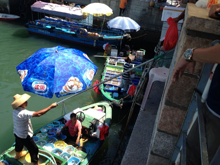 渔民站在船里高举着海鲜,向岸上的顾客推销自家的海鲜如何新鲜好卖,继而讨价还价,谈妥后,用带着网的捕鱼竿交收。很多来到这里买鲜货的顾客大概也不是为了讨个好价钱,因为这儿的海鲜似乎并不比市区鱼档里的便宜,可每天在码头对着嚷嚷的买家和卖家还是络绎不绝,我想,大概是为了这份热闹和悠然自得的心情吧。 冰蓝/图文