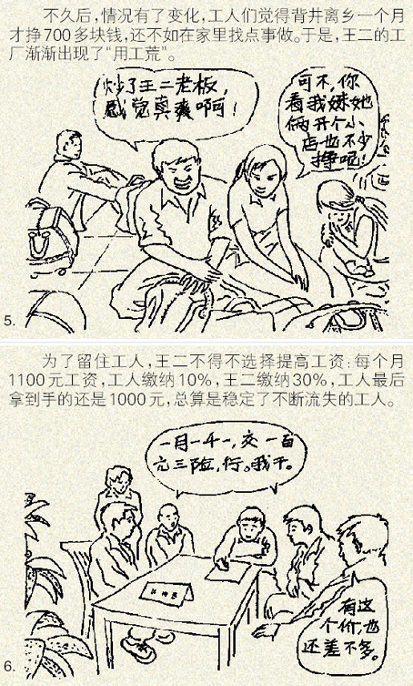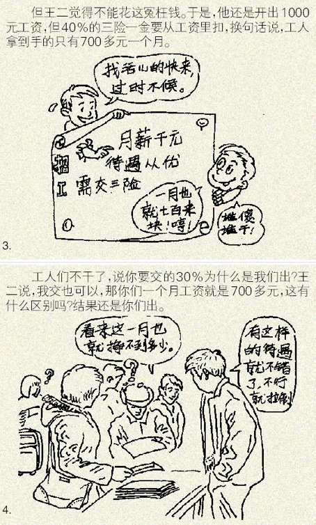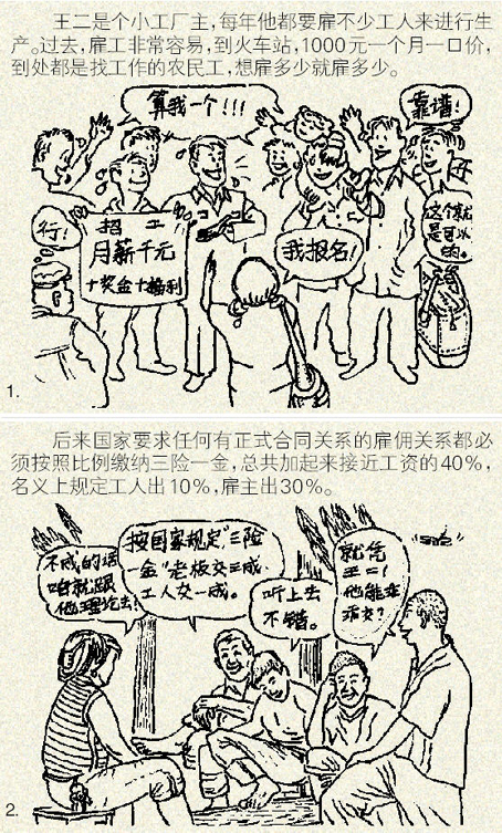 王二雇工的故事说明了,对工资征税的负担究竟是由雇主承担还是由雇员来承担,取决于劳动力市场的状况。中国的农民工市场的特点是,如果你愿意支付市场的工资水平或者略高一些,你就可以雇佣到很多工人,但市场的工资水平整体上是农民工可以接受的底线,因此,你稍微降点工资,立刻就会出现民工荒,对这样一个市场,用术语说就是供给弹性很大,将税收转嫁给工人是很难的。
