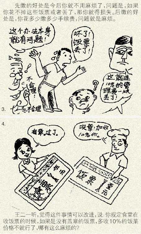 这个故事解读了增值税和个人所得税。两者虽不相同却又实质相似,相似是因为最终都是对收入征税,只是交的时间和环节不同罢了。买饭票时缴手续费,就像个人收入所得税,在拿到收入的同时就把税缴了。另一种对收入征税的方式是,在用钱的时候征收,也有两种方式,复杂的方式是在每一笔交易发生的时候都额外收税,这就是销售税。简单的方式就是在生产环节征税,这就是增值税,税最后转嫁到消费者头上就是价格上升,就像王二公司的食堂一次性提价10%那样。