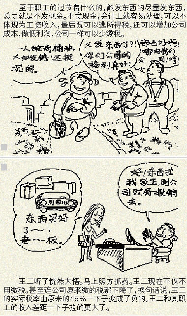王二开公司的故事,重点想讨论的是应不应该对实物福利,或者说非货币福利征收个人收入所得税?答案是:应该。从公平的角度来分析,理由有二。一是不对实物福利征税是对按章纳税的公司和个人的不公平,任何用现金发福利的公司都比发实物福利的公司面临更高的税负,就像被大家笑话的王二;二是不对实物福利征税,很可能会使得收入分配状况更加恶化。不对实物福利收税,最后得益的是高收入阶层。是否征收,涉及一个税收体系是否公平合理的问题。