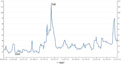 对于中国银行间债券市场来说,2013年是不平凡的一年。伴随利率市场化的步伐突然加快,7天回购中枢抬升60BP至4.10%,债券价格波动更为剧烈,10年国债在3.40%-4.70%区间宽幅震荡,多重因素相互交织作用共同演绎了下半年的一场罕见熊市,彻底击碎了此前哪怕最保守的预期。(图1、2、3、4、5、6)