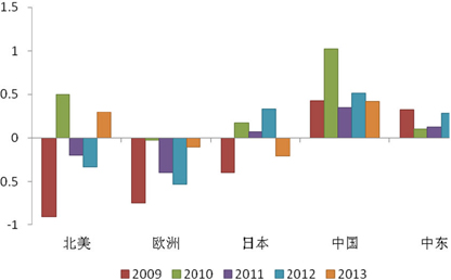 2013年前三季度世界原油需求达9,090万桶/日,较2012年同期增长130万桶/日,近三年增速呈稳步提升态势,显示世界经济复苏形势逐渐好转。