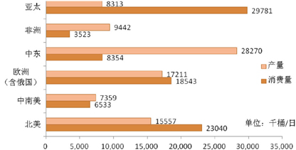2013年北美地区原油产量上升了138.9万桶/日,几乎占据非OPEC原油增量的全部。其他原油生产大国中,俄罗斯于2000年普京执政后大力发展石油经济,原油产量在7年间增长了近2/3,但产储比一直居于世界高位,近年来实行产量温和增长的政策,势头大幅放缓;中国原油生产维持小幅上升态势,增量主要来自海上油气项目,目前产量约415万桶/日,进一步提升空间有限。