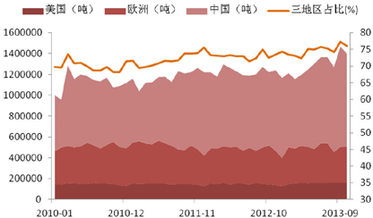 根据WBMS数据,截至201310月全球精炼铜消费量为1735.5万吨,较上年同期增加3.3%。其中中国精炼铜表观消费量增长8.6%,至793.1万吨,占全球总需求量的45.7%。同期,美国精炼铜消费增长4.8%,欧洲精炼铜消费仅增0.7%
