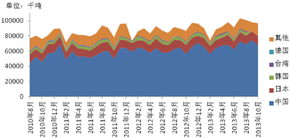 20131-10月,全球主要铁矿石进口国的进口总量达93,443万吨,较2012年同期86,598万吨增长7.90%。其中,中国进口铁矿石66,909万吨,同比增长9.91%,全球占比从70.30%提高至71.60%。亚洲另两个需求大国进口增速出现分化:日本同比增长3.42%376万吨;而韩国同比下降26.59%1,016万吨。(图6