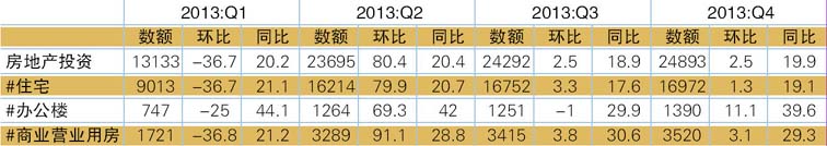 2013年全国房地产开发投资总额86013亿元,同比增长19.8%。投资额绝对值再创历史新高,且几乎达到2009年和2010年投资额的两倍左右。同比增速也高于2009年和2012年。其中住宅投资总额58951亿元,同比增长19.4%;办公楼投资和商业营业用房投资同比增长分别为38.2%28.3%,继续遥遥领先住宅投资增长幅度。