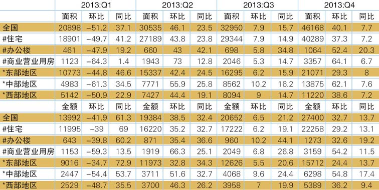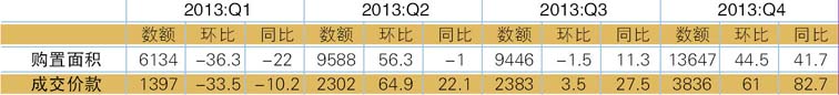 2013年市场销售业绩超预期,其原因也是多方面造成的,首先,国五条的出台不但没有收到预期效果,反而激发了市场规避政策风险的情绪,形成集中购房热潮,3月份量价齐升。其次,9月前经济下行和地方财政收入下行的压力,需要发挥房地产在稳增长中的作用,也使大量资金流入房地产市场;加上一些地方地王频现,助长了房价看涨和恐慌入市的情绪。尤其是去年四季度中,商品房和商品住宅销售面积和销售金额逐月上升。环比增幅也逐月加大,以商品房销售面积为例,十一月份比十月份增长28.8%,十二月份比十一月份增长32.7%,房地产市场四季度高歌猛进,呈现出近两年少有的火热行情。分类物业看,住宅无论销售量或销售金额绝对值还是环比涨幅,都优于办公楼和商业营业用房,后两者的销售具有一定的起伏性和不确定性。