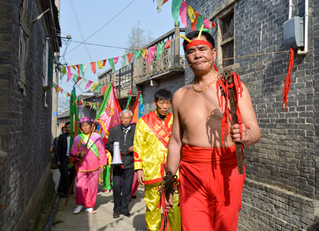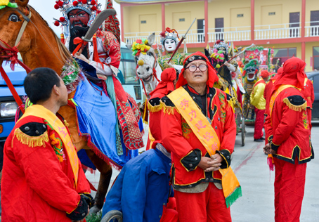 今年的祭神游街仪式,已不仅是本庄的事了,寺里面要做佛事,兄弟村镇获垛乡的庙会队伍也要来赛会。400多人的组织安排,会长熊必义,这些日子忙得脚不沾地,几过家门而不入。初二傍晚,村中炊烟袅袅时,我们才在法华寺的门前截住了刚准备回家的熊会长和“马皮”。