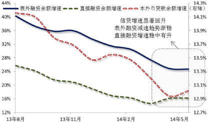 一季度表内信贷融资渠道力度明显不足,原因或在于:(1)存款分流形势加剧下,商业银行贷存比约束增强;(2)市场对于未来央行政策及流动性预期不稳定,银行风险偏好下降,信贷投放较为谨慎;以及(3)政策约束加强、信贷额度紧张等。目前,虽然信贷投放在稳增长政策导向下已经向基建投资定向宽松,但5月份投资到位资金同比增速仍处于历史低位,并且继续低于同期投资增速,显示资金瓶颈依旧是经济增长的巨大障碍,当前投资资金约束的边际好转尚不足以支持投资增长明显好转,而且对经济增长至关重要的房地产业融资来源依然紧张。故而,年内出现有利信贷投放的政策的概率在上升,如贷存比计算口径调整、信贷额度约束适度放松以及定向宽松向房地产业扩围等,此外,经济企稳大背景下银行风险偏好的回升,也将有助于其贷款投放意愿的增加。