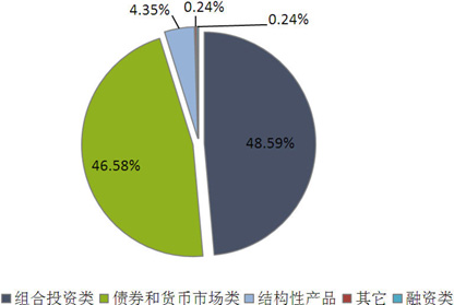 从投向类型来看,债券与货币市场类产品发行2109款,环比增加134款,市场占比上升1.46个百分点至46.58%;组合投资类产品发行2200款,环比增加63款,市场占比下降0.23个百分点至48.59%;融资类产品发行11款,环比减少6款,市场占比下降0.15个百分点至0.24%;结构性产品发行197款,环比减少32款,市场占比下降0.88个百分点至4.35%;其它类产品发行11款,环比减少9款,市场占比下降0.21个百分点至0.24%。(图4)