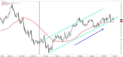 汇率展望:从日线图上可以看出,美元对日元成区间波动走势,但波动区间逐渐收窄,形成三角形态,预计美元对日元将于今年年底前突破形态,并且向上突破的概率较大。这是因为伴随着美国经济复苏态势稳定,美联储将于今年年底结束缩减购债。随着失业率的进一步下降,美联储升息时间亦将再次提上日程,从而支撑美元走高。预计2014年下半年日元的波动区间为【100,106】。(图4)
