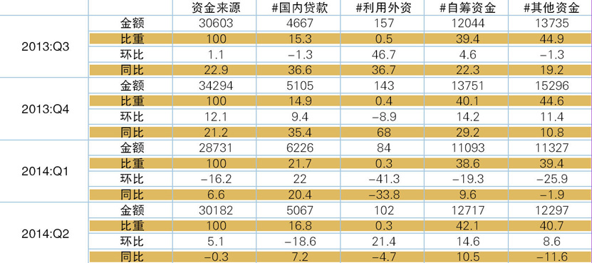 表6 2013年Q3 -2014年Q2开发企业资金来源情况 单位:亿元、%