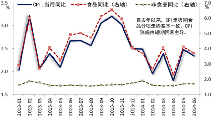 通胀:6月CPI 同比落至2.3%,环比-0.1%,主要受猪价走势在收储政策一次性效应后回归平稳、蔬菜价格仍未走出季节性底部、租金价格在房地产低迷背景下低速增长所致。未来几月内,猪价上行带来的通胀压力将日渐明显,但考虑到居民饮食结构变化以及反腐力度加大下的猪肉需求曲线整体下移,通胀仍可控。(图1)